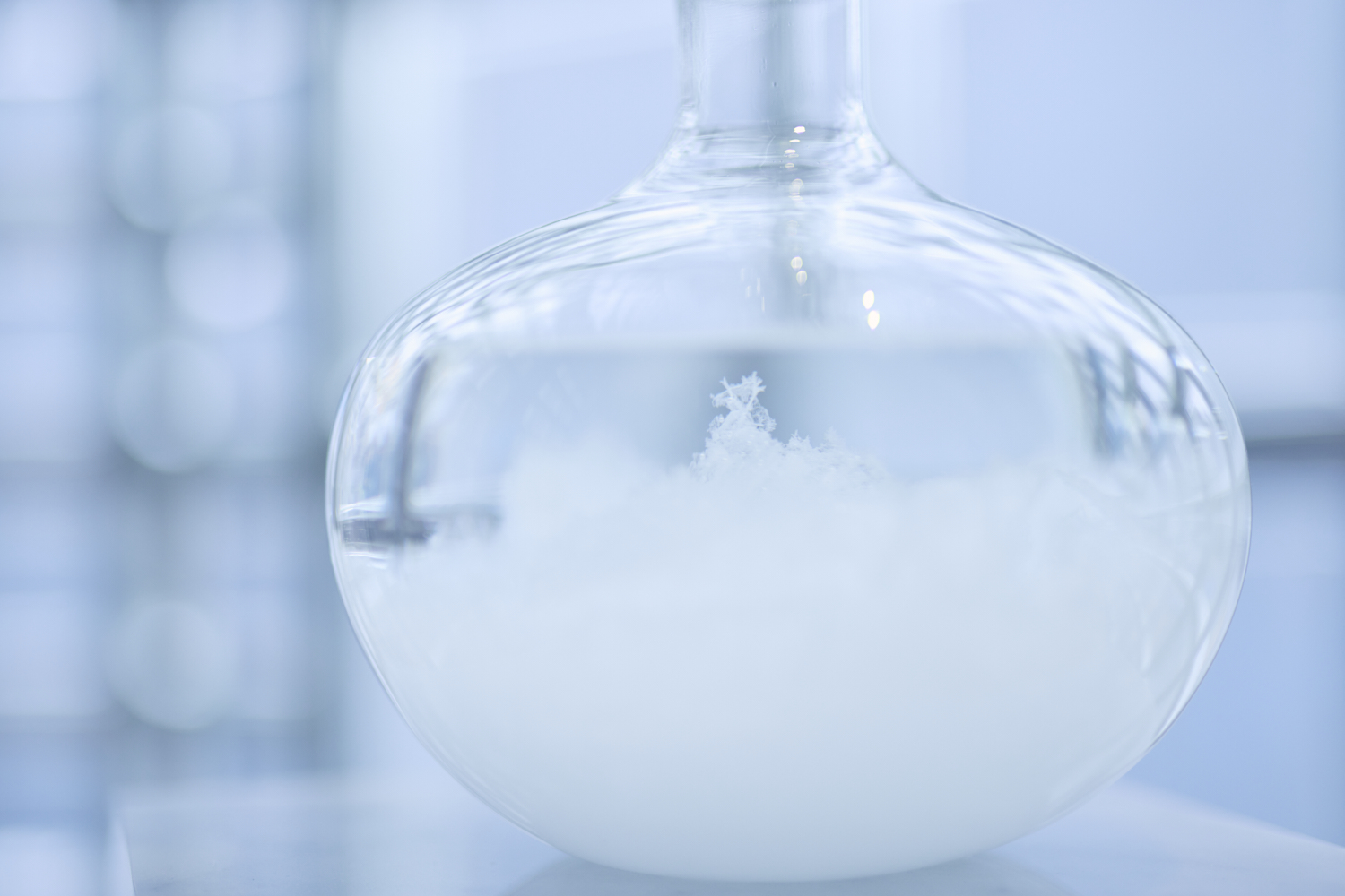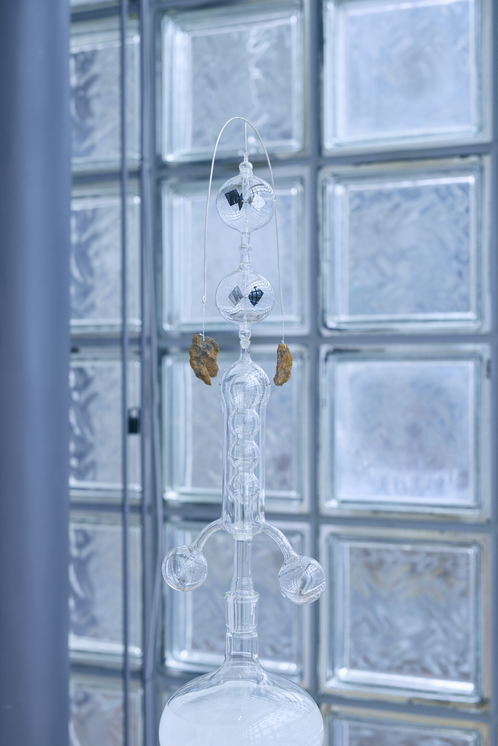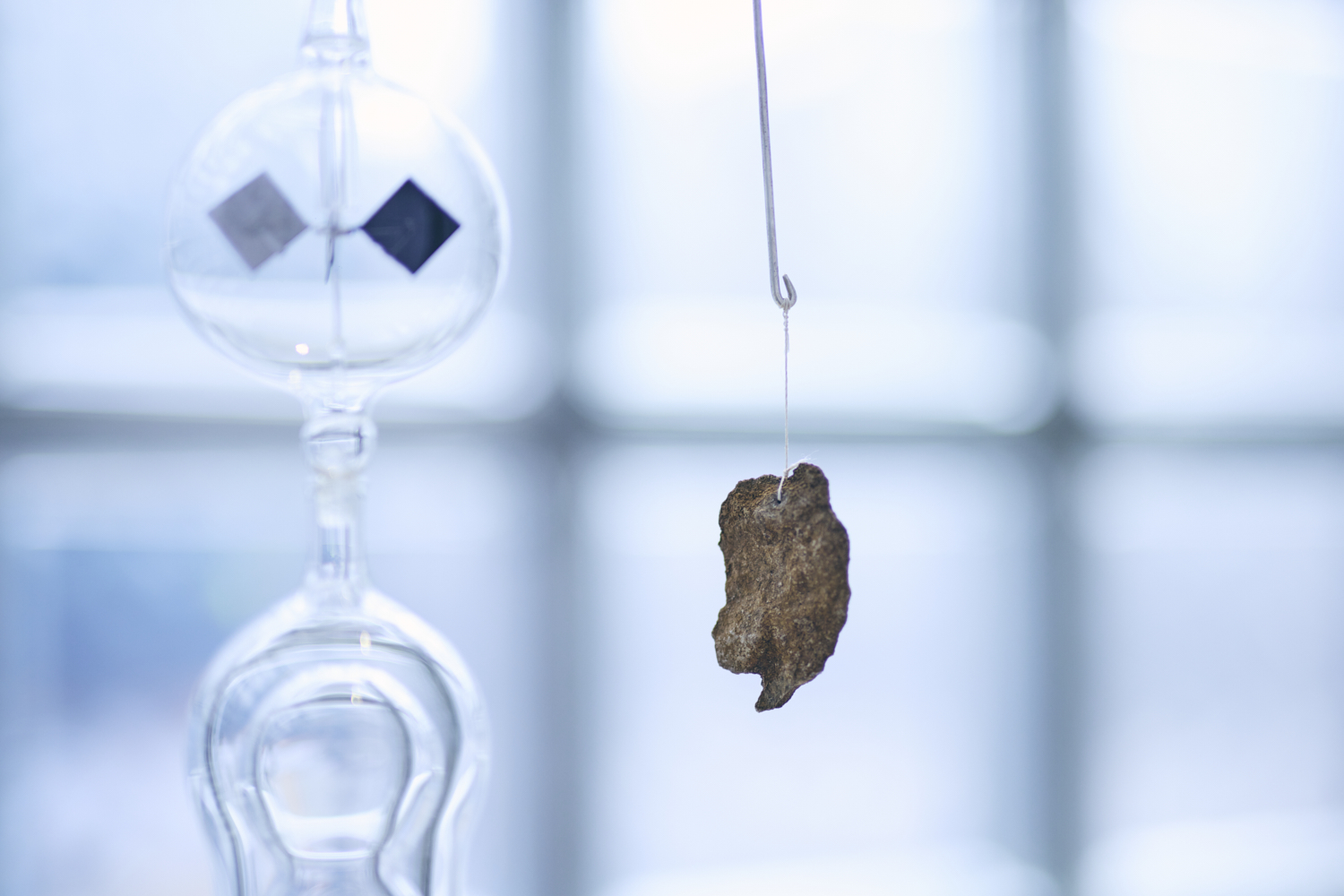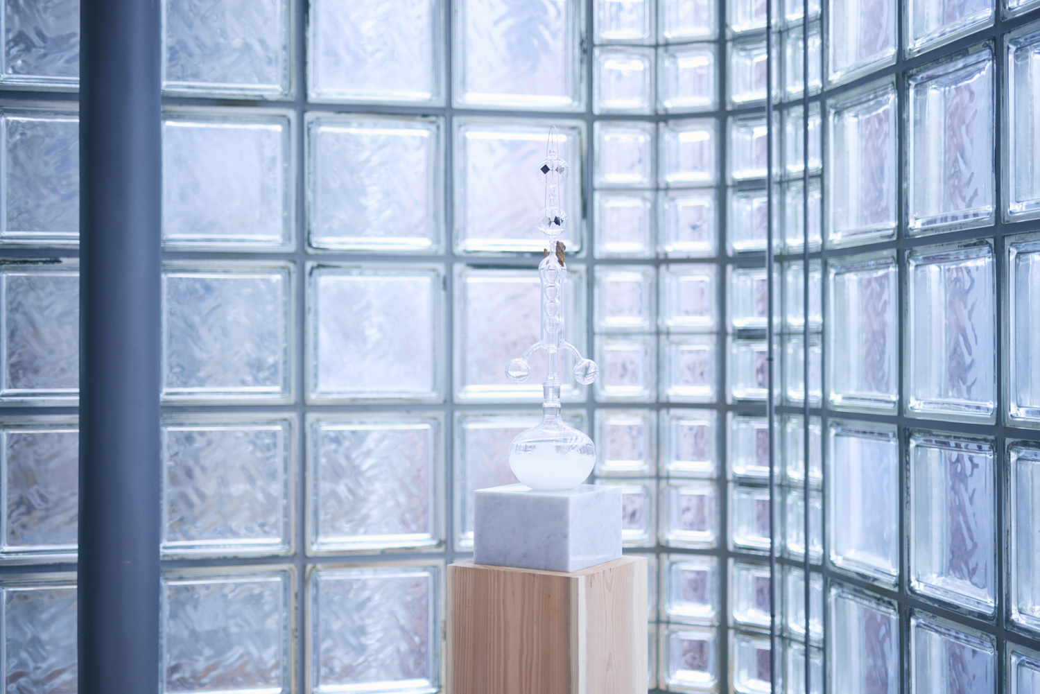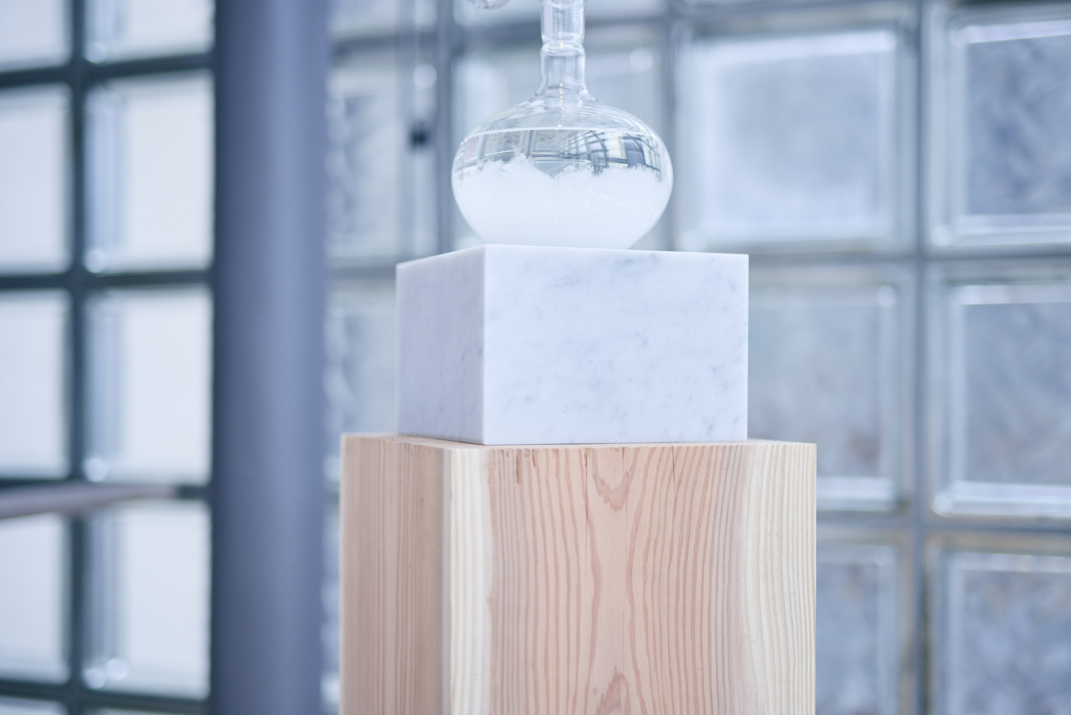In this exhibition, he presents a series of installations consisting of three correlated elements. In noise (2024), Japanese paper made by the artist from rice straw grown in Fukushima Prefecture forms a cylinder that is lit from within by 12 lights and can be entered by visitors. The lights are randomly turned on by the sound of water droplets falling on the drums according to natural rhythm (essential oil and floral liquid extracted from citrus fruits picked in Tokyo, Fukushima, Chiba, and Okinawa). Additionally, both glacier (2024), 24 photographs of glacier ice found during fieldwork in Nepal melting in hands, and cosmos (2024), based on the storm glass used for weather forecasting in the 19th century, can be seen as attempts to rearrange objects within the grand timeline of planet Earth, and quietly forge new cyclical paths towards the future.